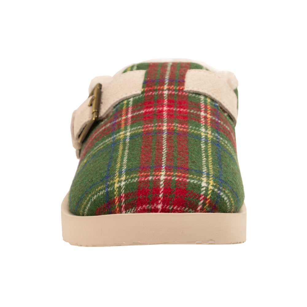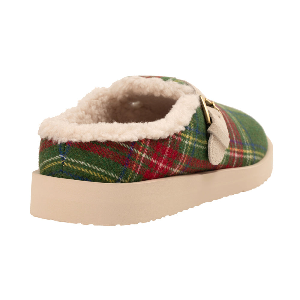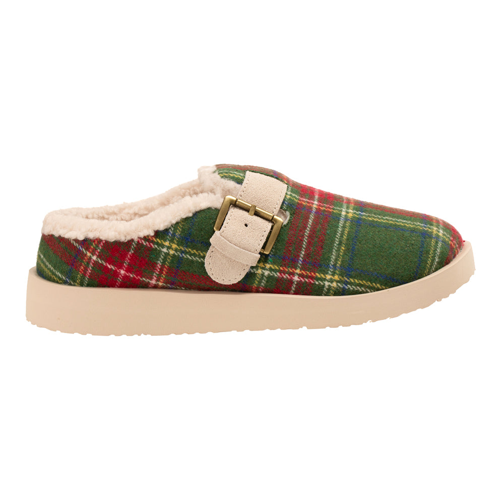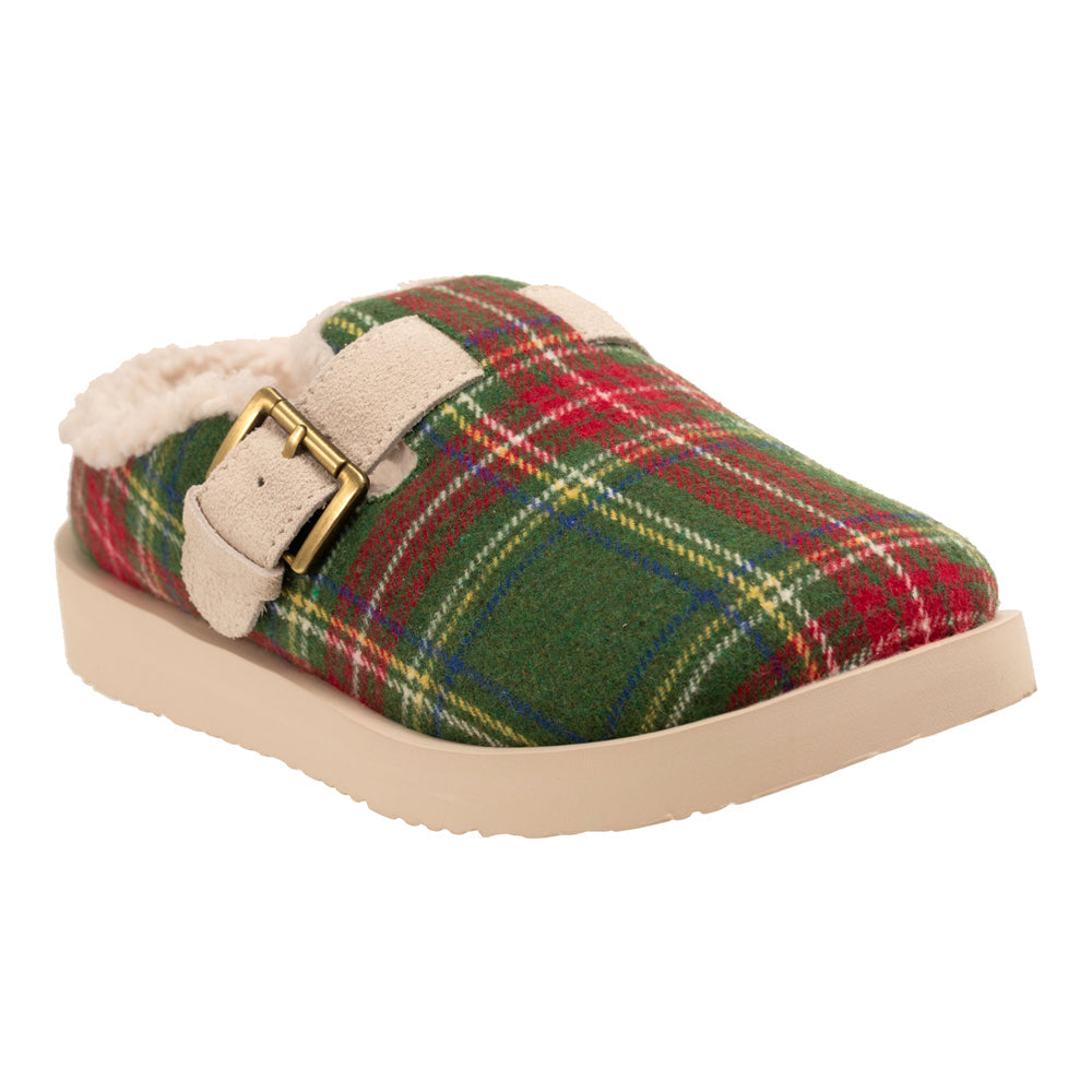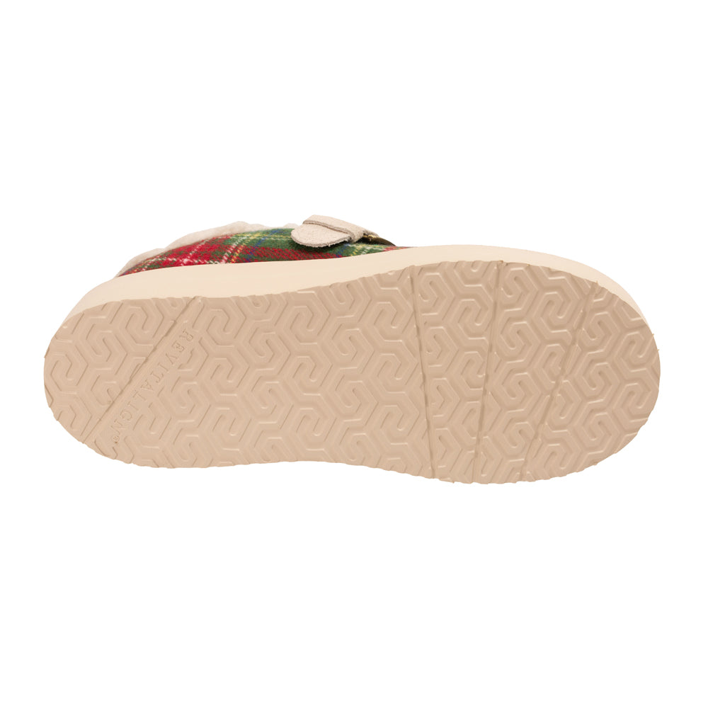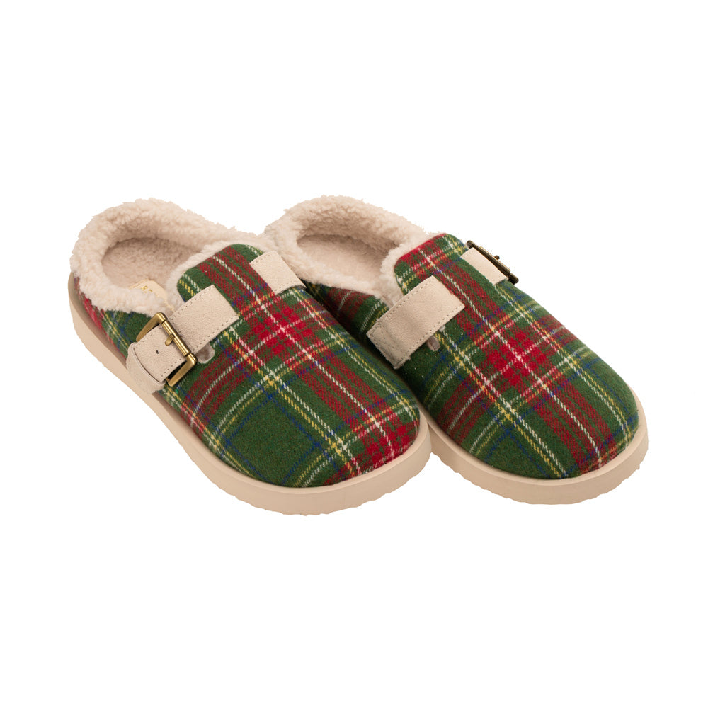 - Year round slipper in velvet or playful plaid with genuine suede adjustable strap