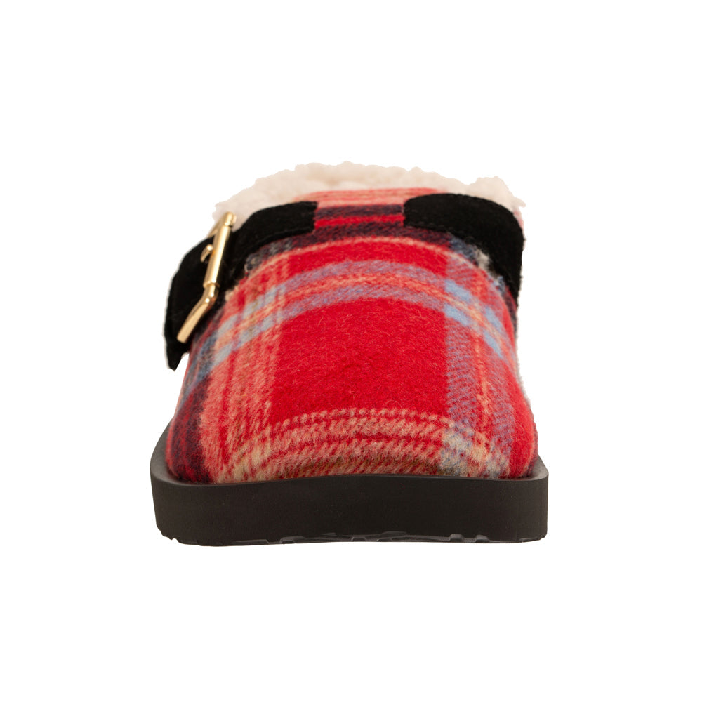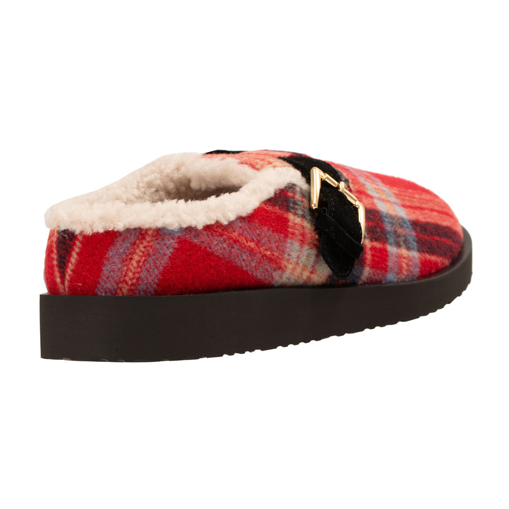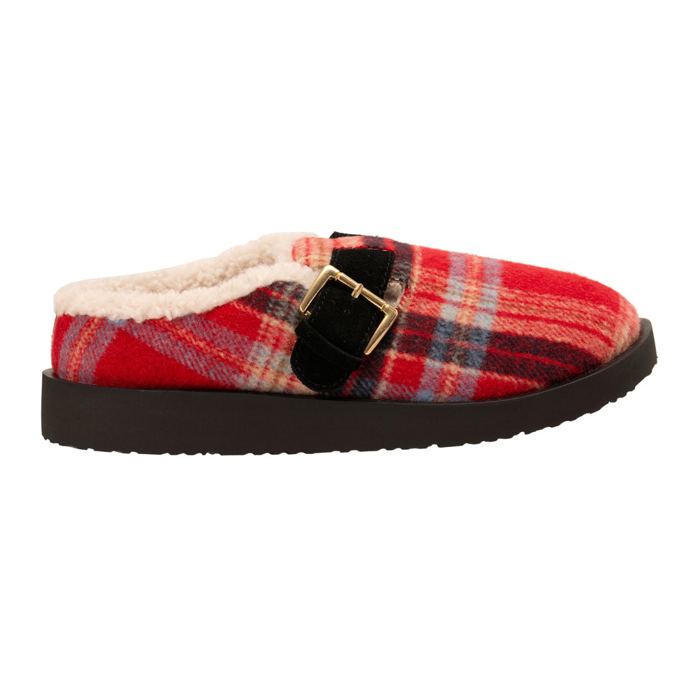 - Year round slipper in velvet or playful plaid with genuine suede adjustable strap