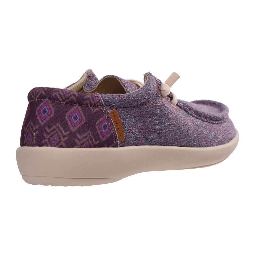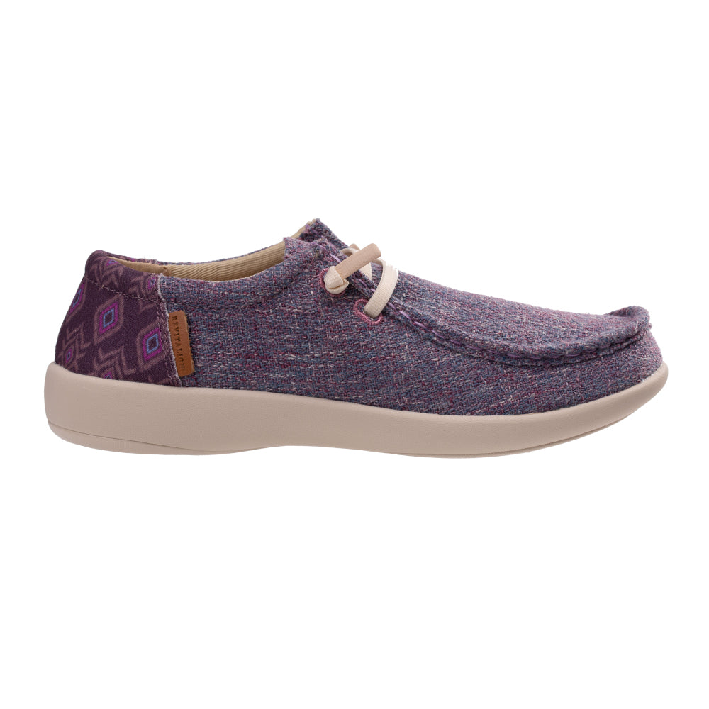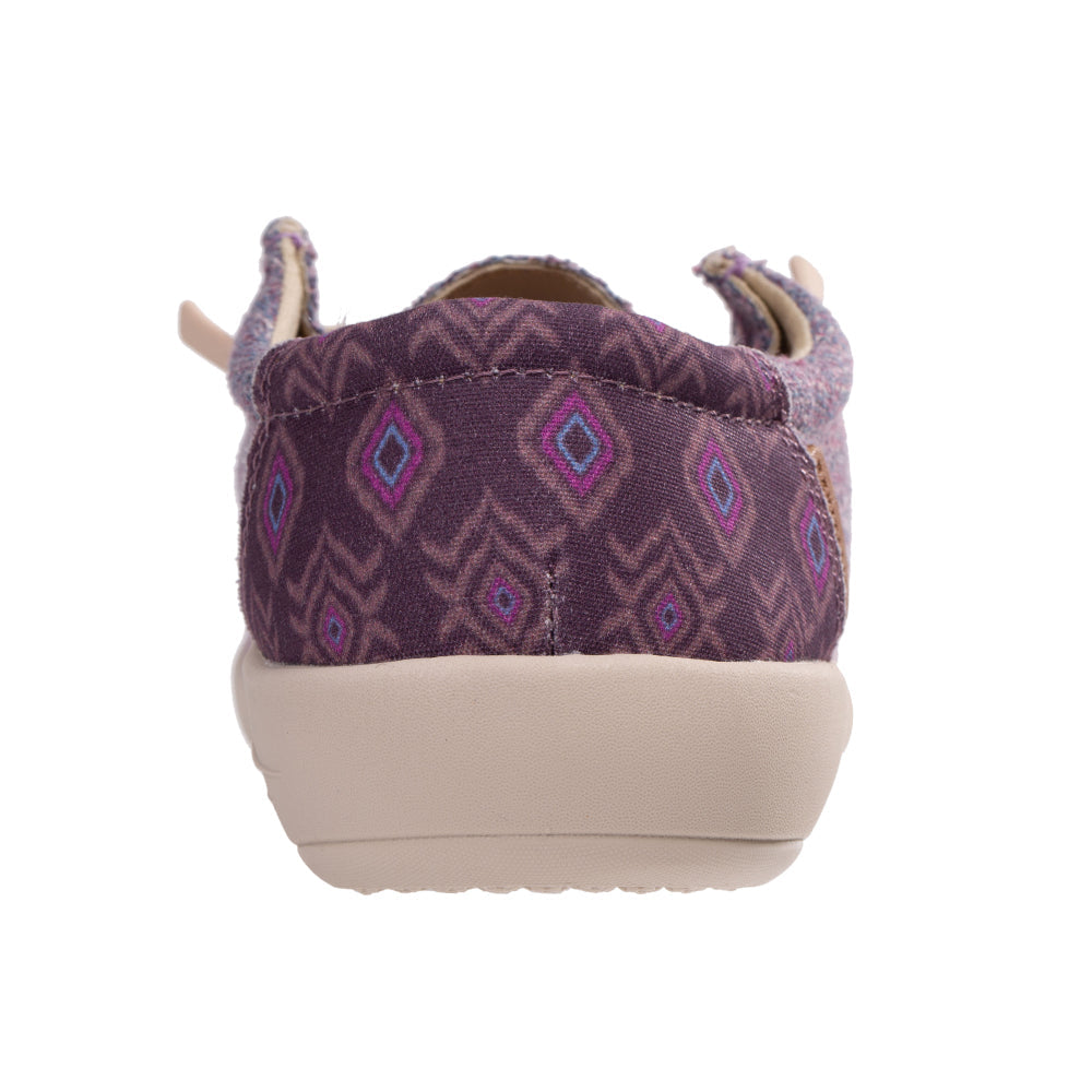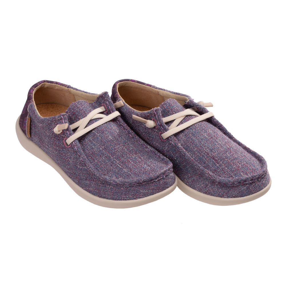 - Textured 4-season slip on featuring denim with a playful bohemian print in the heel