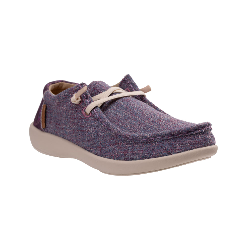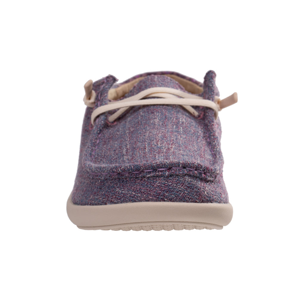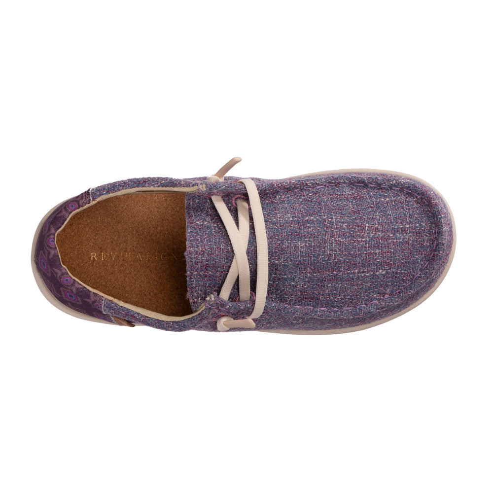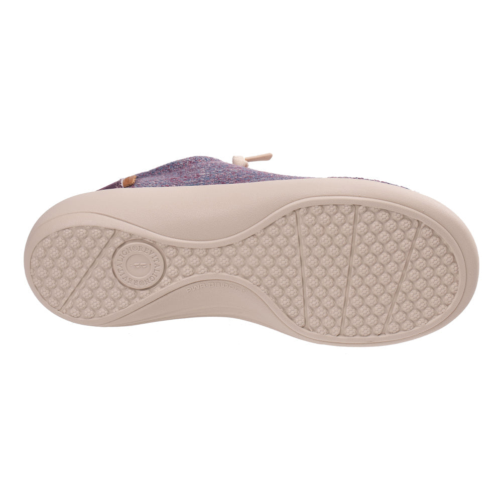 - Textured 4-season slip on featuring denim with a playful bohemian print in the heel