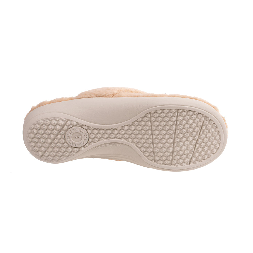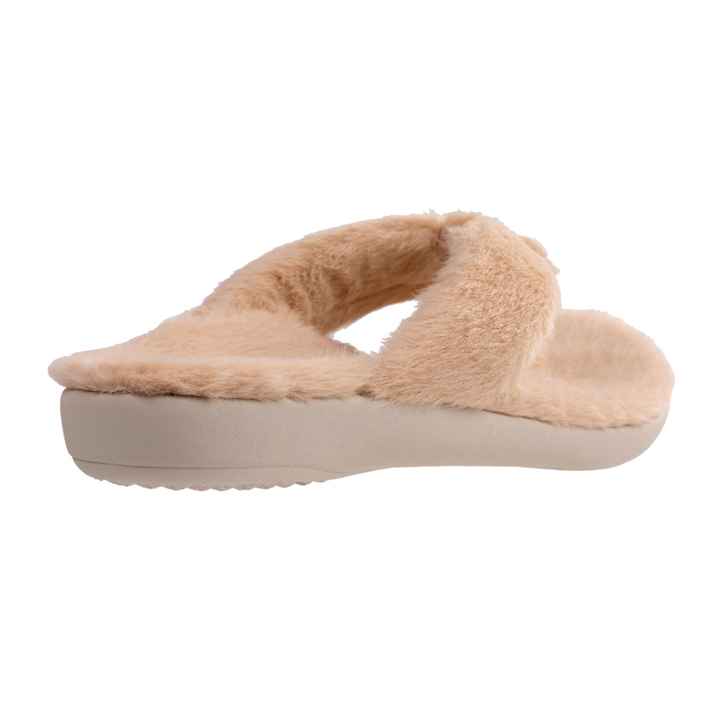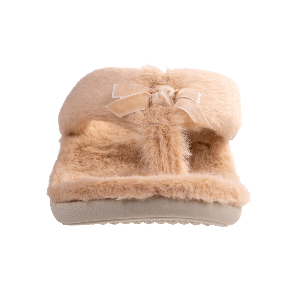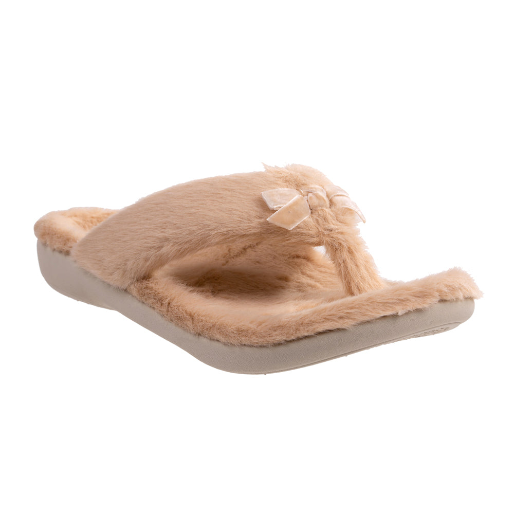 - Cute as a button, toe-post memory foam slipper wrapped in plush faux fur