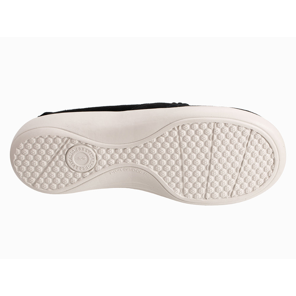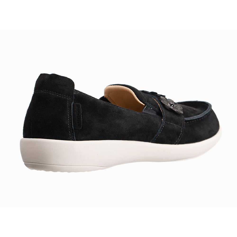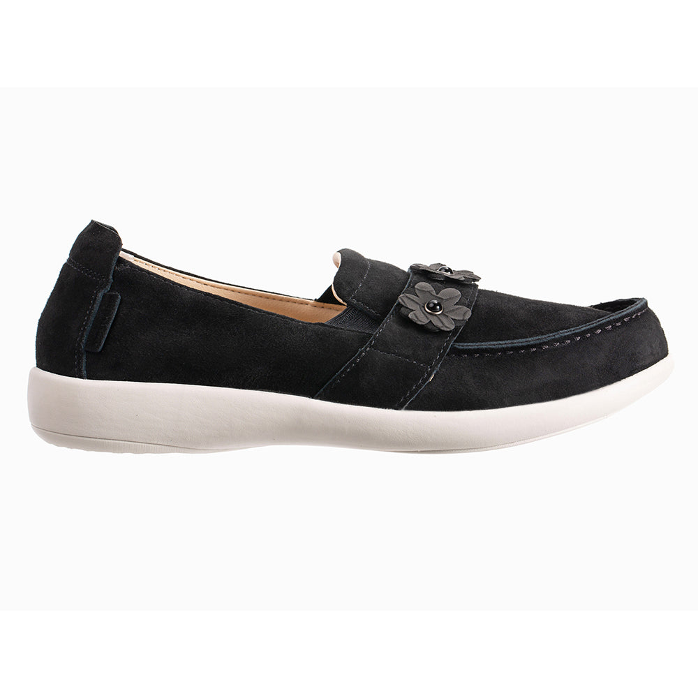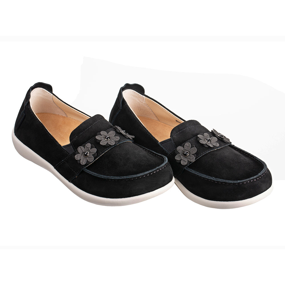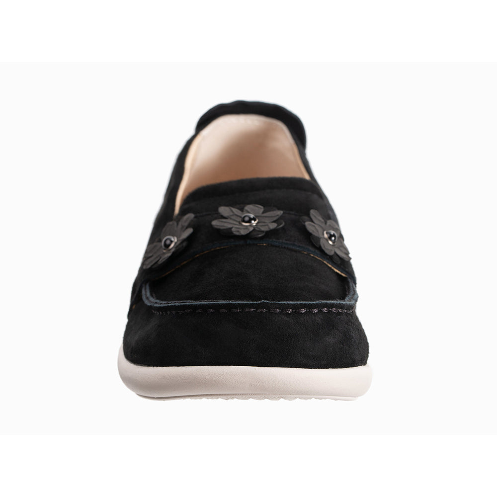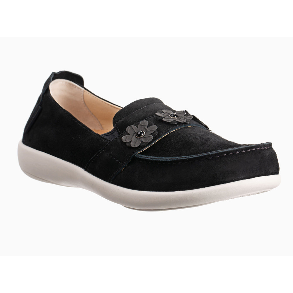 - Genuine suede upper features soft feminine floral trim