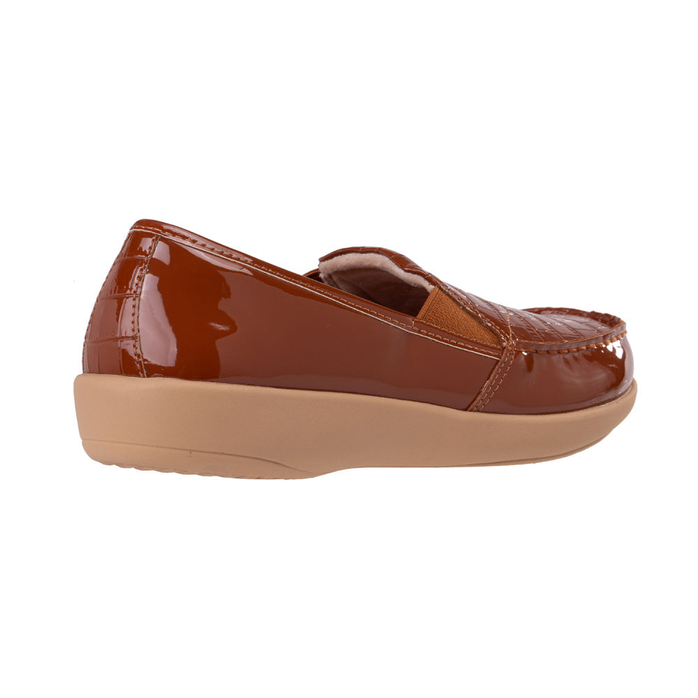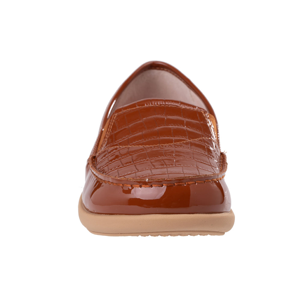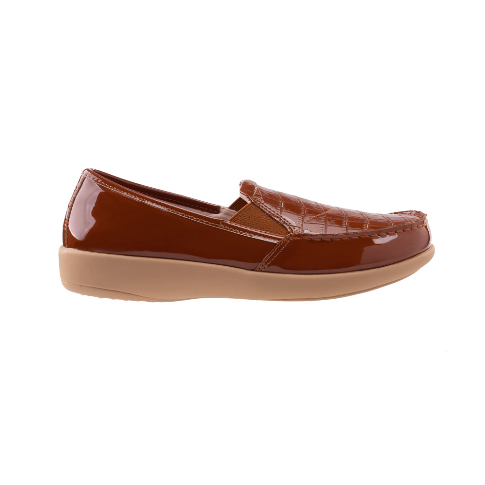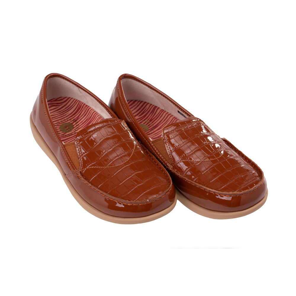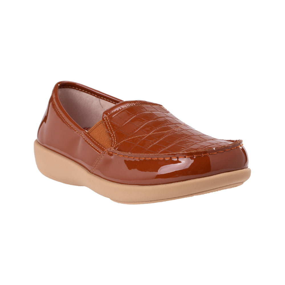 - Casual slip-on kick-off styling featuring vegan friendly debossed patent leather